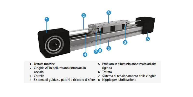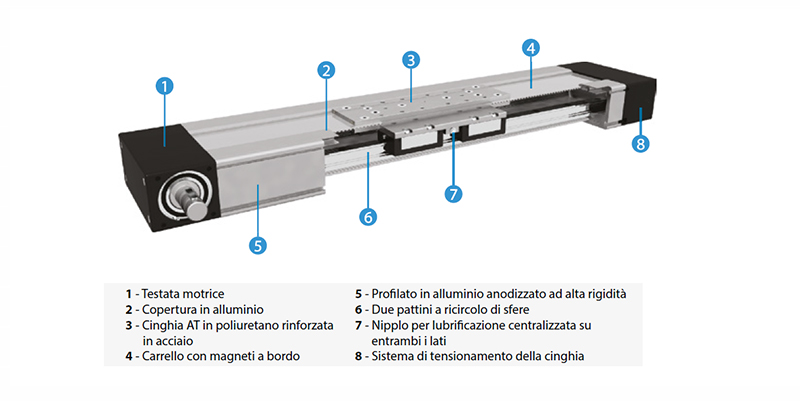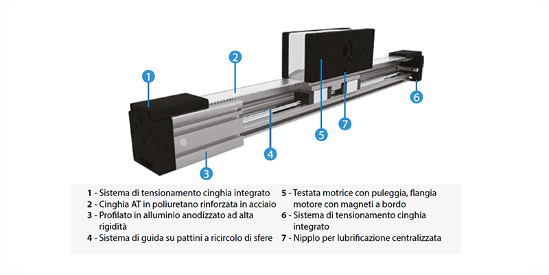 Unità lineari compatte con cinghia dentata rinforzata con inserti in acciaio temprato e sistema di guida integrato a gioco zero. Il profilo in alluminio estruso ad alta rigidità, con anodizzazione resistente, è lavorato all’interno in un solo passaggio, onde ottenere movimenti precisi e accurati. L’unità lineare è azionata da una puleggia a gioco zero. La cinghia dentata in poliuretano è guidata nella scanalatura del profilo e protegge lo stesso da contaminazioni esterne. Due porte centralizzate permettono la rilubrificazione del sistema di guida su pattini a ricircolo di sfere.