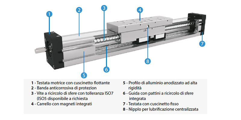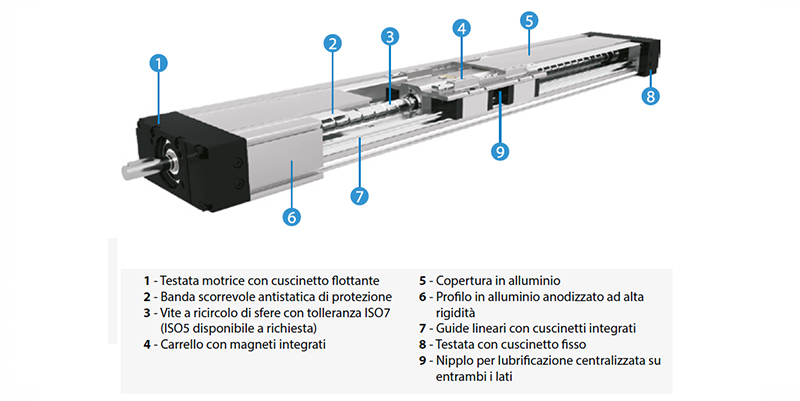 Unità lineare con trasmissione a vite senza fine di precisione a ricircolo di sfere con sistema a doppia guida su pattini a gioco zero integrata nel profilo. Il profilato in estruso di alluminio ad alta rigidità, con anodizzazione resistente, viene lavorato internamente in un unico passaggio in modo da ottenere movimenti del carico precisi e lineari. Due nastri di tenuta scorrevoli ed una copertura di alluminio proteggono tutte le parti del profilo da polvere e altri contaminanti. Le porte di lubrificazione centralizzate permettono la rilubrificazione della vite a ricircolo di sfere e del sistema di guida su pattini a ricircolo di sfere.