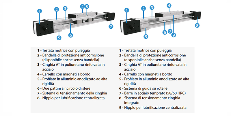 Unità lineare compatta con corpo in alluminio estruso di precisione con trasmissione a cinghia dentata rinforzata con trefoli in acciaio temprato e puleggia di trasmissione a gioco zero. La cinghia dentata in poliuretano è guidata nella scanalatura del profilo e protegge lo stesso da contaminazioni esterne. Per una migliore protezione delle parti interne l’unità lineare può essere sigillata con un nastro di protezione anti corrosione. Una porta centralizzata permette la rilubrificazione del sistema di guida su pattini a ricircolo di sfere.