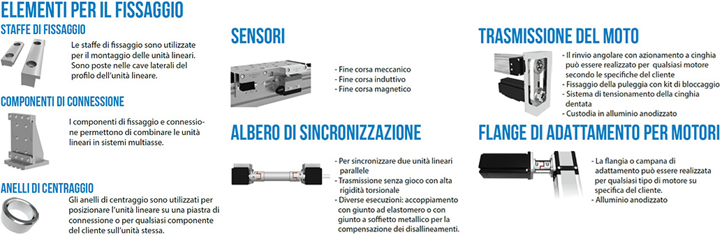 Le serie MTJ e MRJ è costituita da unità lineari con trasmissione a cinghia dentata di dimensioni compatte che offrono elevata capacità di carico, alta velocità, precisione e ripetibilità. Queste unità lineari possono essere combinate per realizzare sistemi lineari multiassiali, offrendo un eccellente rapporto prestazioni/ prezzo con tempi di consegna rapidi. Il profilo compatto in lega di alluminio Al 6063, accuratamente estruso, è protetto mediante anodizzazione dura. La serie MTJ presenta un sistema di guida, caratterizzato da rotaia con carrelli a ricircolo di sfere, che permette di spostare carichi elevati ad una velocità di 3 m/s. La serie MRJ presenta un sistema di guida, caratterizzato da rotelle (cuscinetto portante) che scorrono su due barre in acciaio temprato 58/60 HRC, che risulta ideale per velocità elevate fino a 10 m/s. Il profilo in alluminio contiene scanalature a T per il fissaggio dell’unità lineare e l’installazione di varie tipologie di finecorsa (meccanici, induttivi e magnetici). Le unità lineari MTJ e MRJ utilizzano una cinghia dentata di poliuretano tipo AT, rinforzata con trefoli in acciaio. Questo tipo di cinghia lavora con una puleggia a “gioco zero” per conseguire una elevata precisione ed una trasmissione di carico elevato, ottenendo anche bassa rumorosità ed usura limitata nel tempo. La cinghia dentata funge anche da protezione dei componenti di trasmissione e traslazione interni. Le unità lineari possono essere schermate con un nastro di protezione metallica resistente alla corrosione per operare anche in ambienti ostili. Sono disponibili diverse lunghezze di carrelli che vengono forniti con lubrificazione centralizzata e accessori vari per consentire la manutenzione periodica. Le unità lineari MTJ e MRJ possono essere fornite già predisposte per il fissaggio del motore e del riduttore in diverse posizioni.