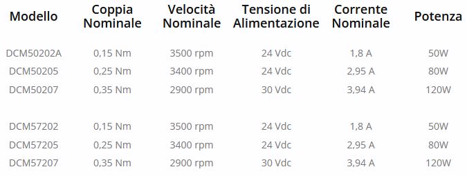 La differenza tra i DCM50 e i DCM57 è meccanica, i primi si presentano con flangia tonda mentre i DCM57 con flangia quadra, 57×57 mm, NEMA23 perfettamente compatibile con le dimensioni meccaniche dei motori passo passo. A parità di taglia offrono le stesse performance.